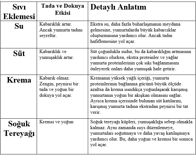 Diğer tekniklerde olduğu gibi bu yazımızda da sıcaklık ve zaman faktörlerinin üstünde duracağız. Ancak yumurtalar başka sıvı içerik ile de karıştırıldığı için karışımlara ve sıvı türlerinin etkilerine de değineceğiz.