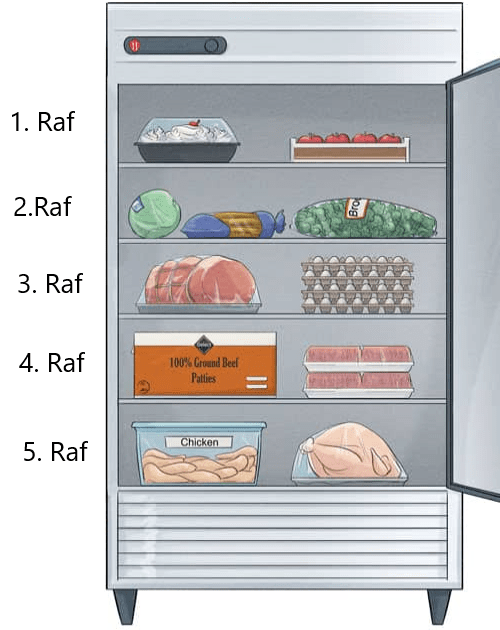 - Raf: Pişirmeye hazır ürünler en üst rafta depolanmalıdır.